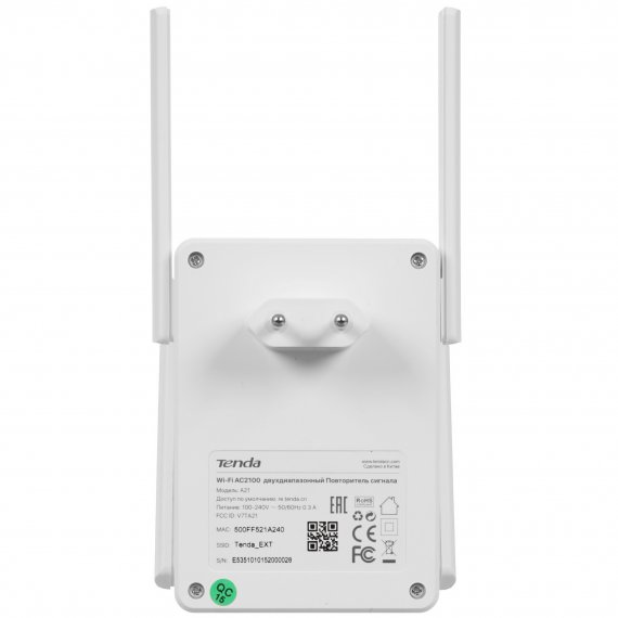 Wi-Fi-репитер Tenda A21 оснащается клавишей WPS на корпусе, при помощи которой устройства к беспроводной сети можно подключать без ввода пароля. Модель подключается к розетке сети 220 В и поддерживает работу в режиме репитера или точки доступа, которая передает данные на частотах 2.4 или 5 ГГц. Поддерживается и одновременная работа в двух частотных диапазонах.